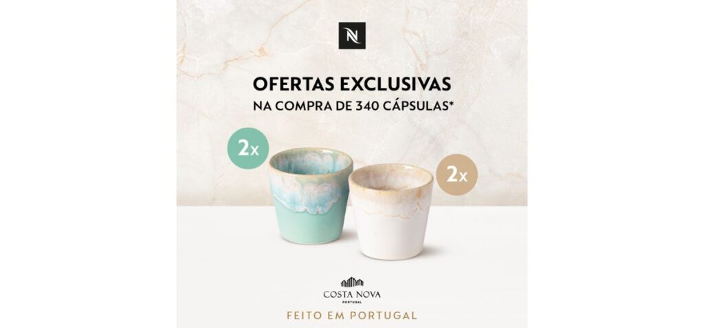 Até dia 27 de Fevereiro é possível desfrutar da oferta de copos Grespresso, ao fazer compras na Nespresso. As condições da oferta estão descritas no site da reconhecida marca de café, onde os copos da COSTA NOVA, nas cores branco e acqua, surgem em destaque.