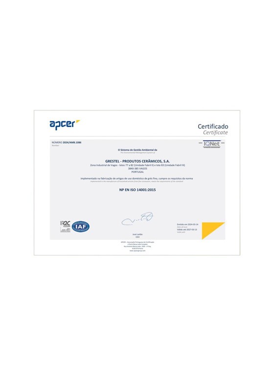 O grés utilizado representa qualidade, estética, design, durabilidade e sustentabilidade. A nossa fórmula original, resultante de uma junção de argila com uma superfície envidraçada, aumenta a durabilidade das peças. Portanto, a vida útil dos nossos produtos destaca-se face a outras cerâmicas, o que evita a sua rápida substituição e minimiza o consumo de recursos.